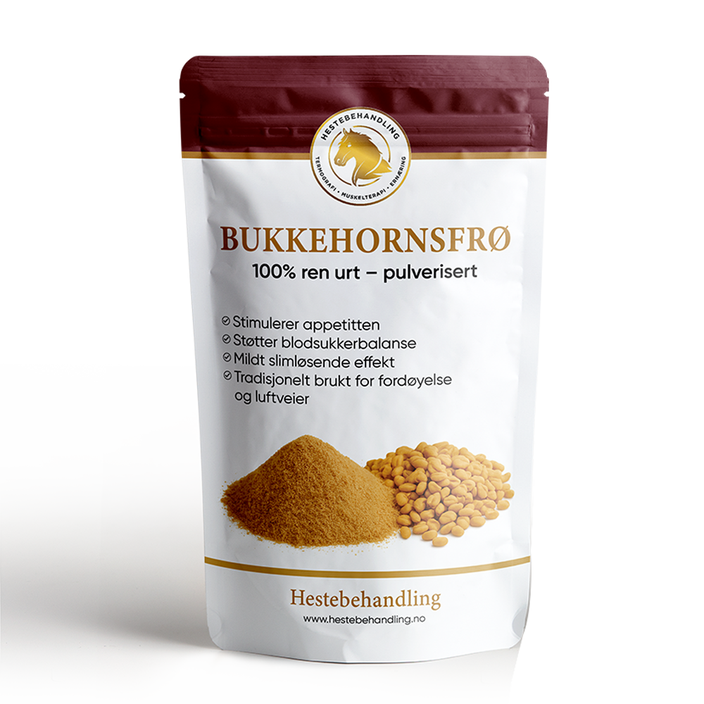 Bukkerhornsfrø (Trigonella foenum-graecum) er en tradisjonsrik urt som brukes til hest når man ønsker å støtte appetitt, vekt/hold, fordøyelse og generell oppbygging. Den er spesielt kjent som en av de mest effektive urtene for luftveislidelser ved at den er sterkt slimløsende, men også er kjent for å stabilisere blodsukker.
